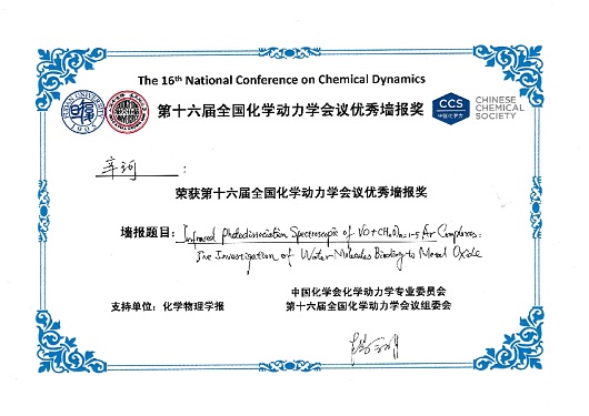 来自全国各科研院所学生制作的250余份海报参加了展讲评选,20张海报获评优秀墙报奖,我院2017级博士生辛珂同学题为“Infrared Photodissociation Spectroscopic of VO+(H2O)n=1-5Ar complexes: the investigation of water molecules inding to metal oxide”的海报名列其中。