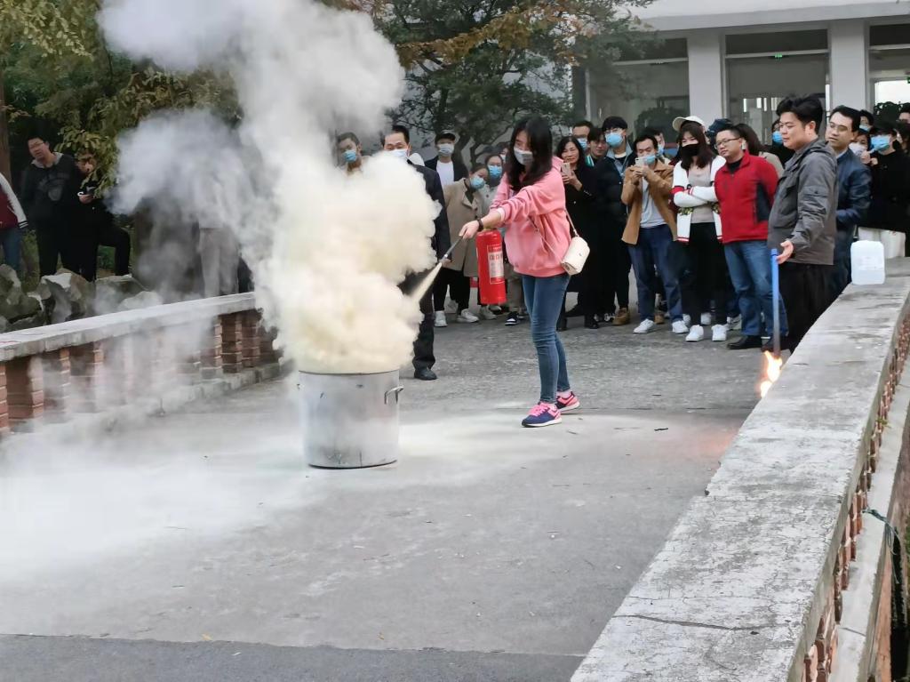 讲座结束后,在化学馆举行了安全逃生演习。在工作人员的指挥下,全体参加演练的师生积极配合,快速有序地从各处安全通道撤离出化学馆。随后,师生们来到工程试验馆门前的空地上参加消防实战演练活动。韩老师首先点燃演示油桶,示范了灭火器的使用方法,对讲座中涉及的内容进行回顾,随后同学们纷纷走上前,一个一个拿起灭火器对准火苗的根部进行扑灭,实践、熟悉灭火器的使用。整个实战演练活动紧张有序,圆满成功。