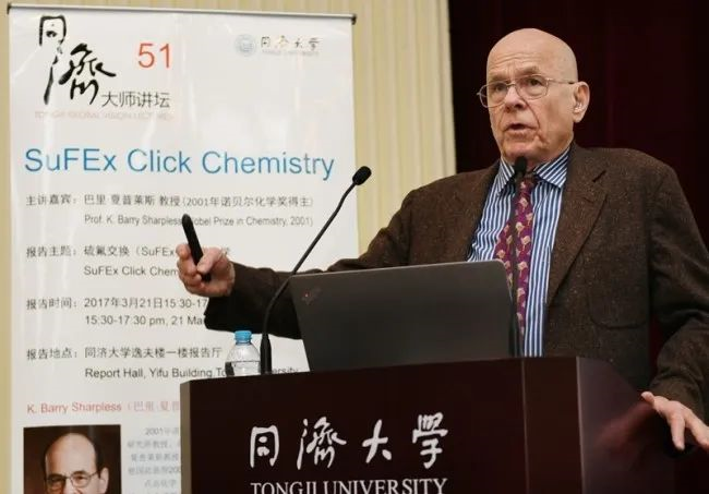 图6 2017年3月,永利集团化学学科建立80周年之际,我院邀请诺贝尔化学奖得主K. Barry Sharpless教授(学院特聘名誉教授)为师生做科学讲座