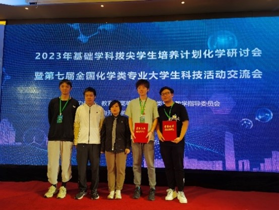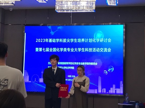 10月27-29日,由教育部高等学校化学类专业教学指导委员会主办、南开大学化学学院承办的“2023年基础学科拔尖学生培养计划化学研讨会暨第七届全国化学类专业大学生科技活动交流会”在天津举行,来自全国30多所重点院校的师生参加了本次交流会。学院副院长刘梅川教授带队,师生一行8人参加了本次活动。我院学子谭睿皓、宫正合分获大会优秀报告奖和优秀墙报奖。