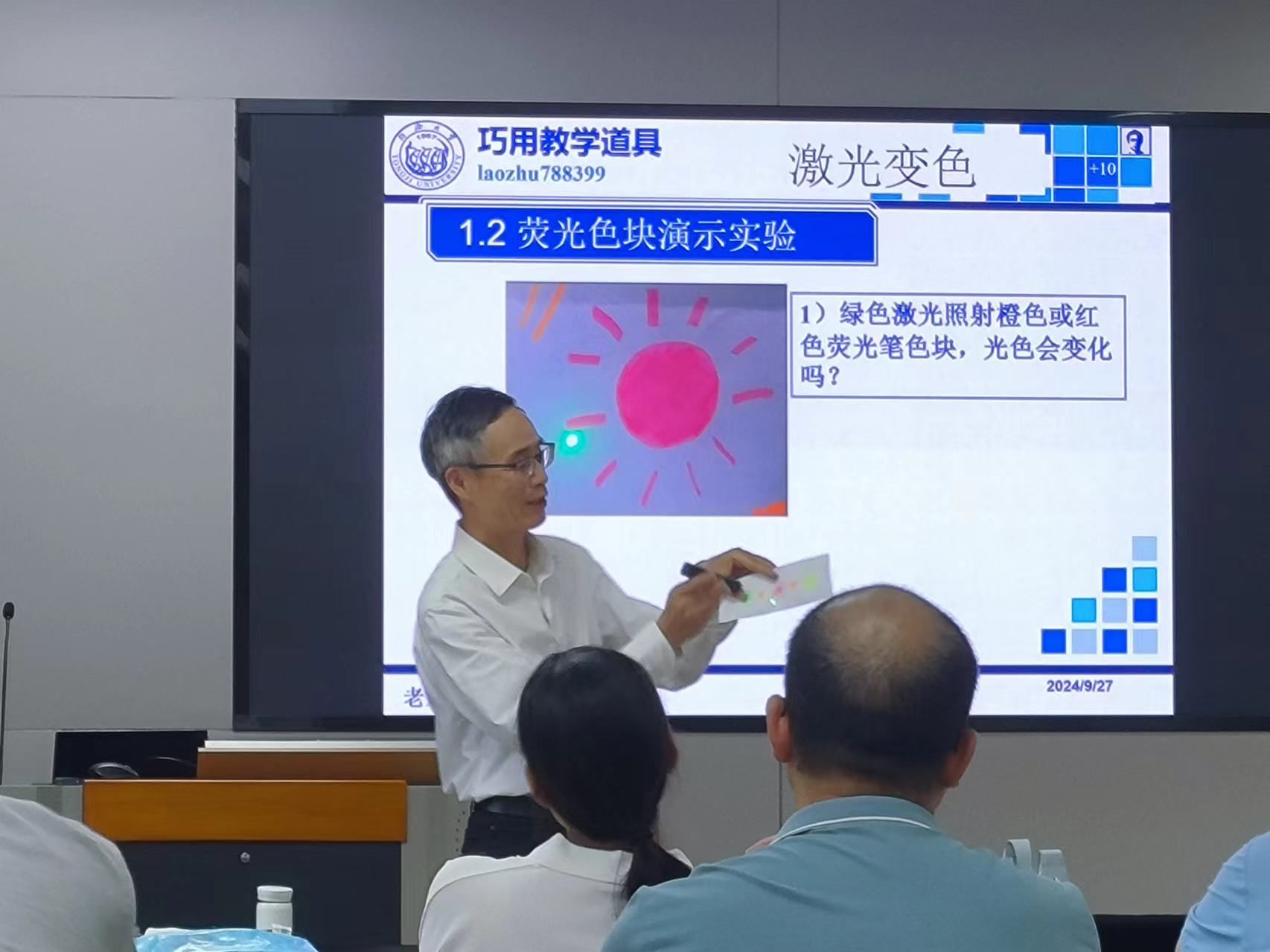 讲座上,朱老师以荧光密写与盲画抽签活动及荧光色块演示实验开场,通过这些互动环节展示了教学道具在实际教学中的应用实例及其在活跃课堂气氛方面的显著效果。红宝石发光实验则利用了学生对宝石的好奇心,成功吸引了大家的兴趣。结合实例,朱老师介绍了一些仪器功能的创新应用,这些新颖的方法不仅令仪器销售人员惊叹,也赢得了在场老师们的高度赞赏。朱老师接着通过演示变色石头在不同光源下的色彩变化,巧妙地引入了光谱学的教学,并从光敏变色现象讲解激发波长的概念。朱老师指出,自己的课程之所以受到学生较高的肯定,一方面是因为他在授课过程中注重从学生的兴趣出发,而非仅从理论知识本身的角度讲解;另一方面,则是他备课时严谨的态度,每次备课都精细到分钟,力求精益求精,从而保证了高质量的教学。