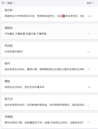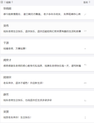 “祝朱老师生日快乐!退休不褪色!执教多年辛苦啦!祝您蚂蚁森林绿树成荫!”这是来自于苏芊蕙同学的美好祝福。“不需江上闲风月,桃李飘香万树春!”这是王宝娟同学对老朱的高度评价。会议过程中,祝福寄语也在仍不断地累积叠加,纷至沓来的美好祝愿将相伴老朱退休之后开启新的一段人生历程。