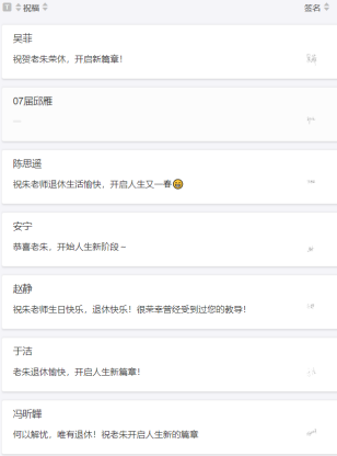 “三尺讲台,实验论坛,课题科研,踏青留影....回忆太多...学而不厌,诲人不倦,桃李芬芳,其乐亦融融...感恩有您,祝老朱退休生活丰富多彩,健康幸福”这是来自于王思聪校友的留言。