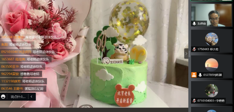 4月19日,还有一个特殊的意义,那就是朱仲良老师六十岁的生日。虽然无法相聚线下向朱老师表达祝福,但仍然仪式感十足地准备了鲜花和生日蛋糕。疫情隔离了我们的距离,但是并不会隔离爱意,一声声“生日快乐”,一句句“退休快乐”不断刷新着屏幕,相信朱老师也能够收获这份满满的幸福。