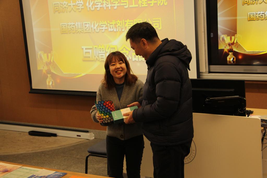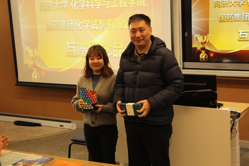 因受疫情防控影响,本次赛事的颁奖典礼推迟到2023年3月3日下午举行,典礼当天,由国药试剂公司为到场同学准备了精美礼品,化学化工学院党委书记曹同成老师对此次竞赛进行点评,同时邀请了国药试剂公司副总经理鲍仌炯女士、市场部经理吴晨雯女士致词,双方代表分别为一、二等奖获奖同学进行颁奖,并互赠纪念品。在典礼活动现场还进行了抽奖问答环节,再一次将同学们学化学、用化学、了解化学、感悟化学的热情点燃。