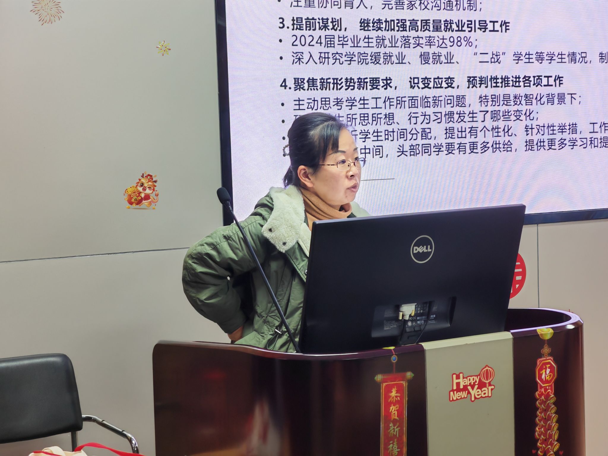母老师首先传达了近期学校学生工作例会的内容,从学生党建及思想教育、班级建设、网络思政教育、心理健康教育、学业指导、各类学生事务、就业等方面介绍了本学期重点工作任务。