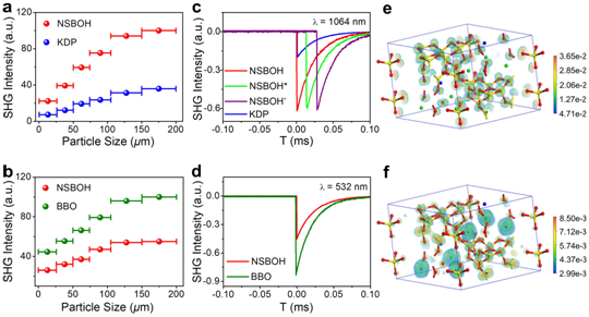 In this study, the research team, based on the chemical synthesis method of borate solution, took the deep ultraviolet second-order nonlinear optical crystal NaSr3Be3O9F4(NSBBOF) as the structural model and adopted the covalent bond modulation strategy for the iso-site replacement of tetrahedral primitives [BO4] and [BeO3F] in the material, to finally obtain the beryllium-free borate crystalline materials. The high concentration of borate solution is conducive to the agglomeration of [BO3]/[BO4] groups into B-O clusters with a higher nucleus, further forming a covalent framework with a three-dimensional structure. This structure can give the material a large optical band gap, achieving a higher UV transparency. Based on this covalent bond modulation strategy, the research team successfully designed and synthesized a beryllium-free hydroxyborate composed of [B9O19] clusters. According to experimental results, the NSBOH crystal shows good physicochemical stability, with a UV absorption cutoff smaller than 190 nm, consistent with the theoretical value of 178 nm. NSBOH has a strong SHG response (3.3 × KH2PO4 @ 1064 nm, 0.55 × β-BaB2O4 @ 532 nm) in both visible and ultraviolet bands, which is the maximum value of deep ultraviolet borate crystalline materials, demonstrating excellent performance as a deep ultraviolet second-order nonlinear optical crystal material. This research is of great significance for the exploration of deep ultraviolet second-order nonlinear optical crystals with excellent design performance in hydroxyborate systems.