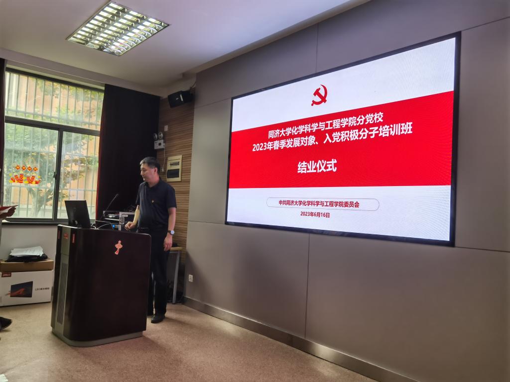 结业仪式后,母朝静给学员们讲授了主题党课。首先,母朝静分享了主题教育理论学习、调查研究等开展情况体会,并从学习习近平总书记给中国农业大学科技小院的同学们回信精神引申开来,希望同学们能够“自找苦吃”,更要吃得苦,做大事。然后,他与学员们共同学习了新时代同济文化的阐释、传承与弘扬。最后,他以《同济化学发展的历史、现状与未来》为题对学院学科文化进行了阐释解读。