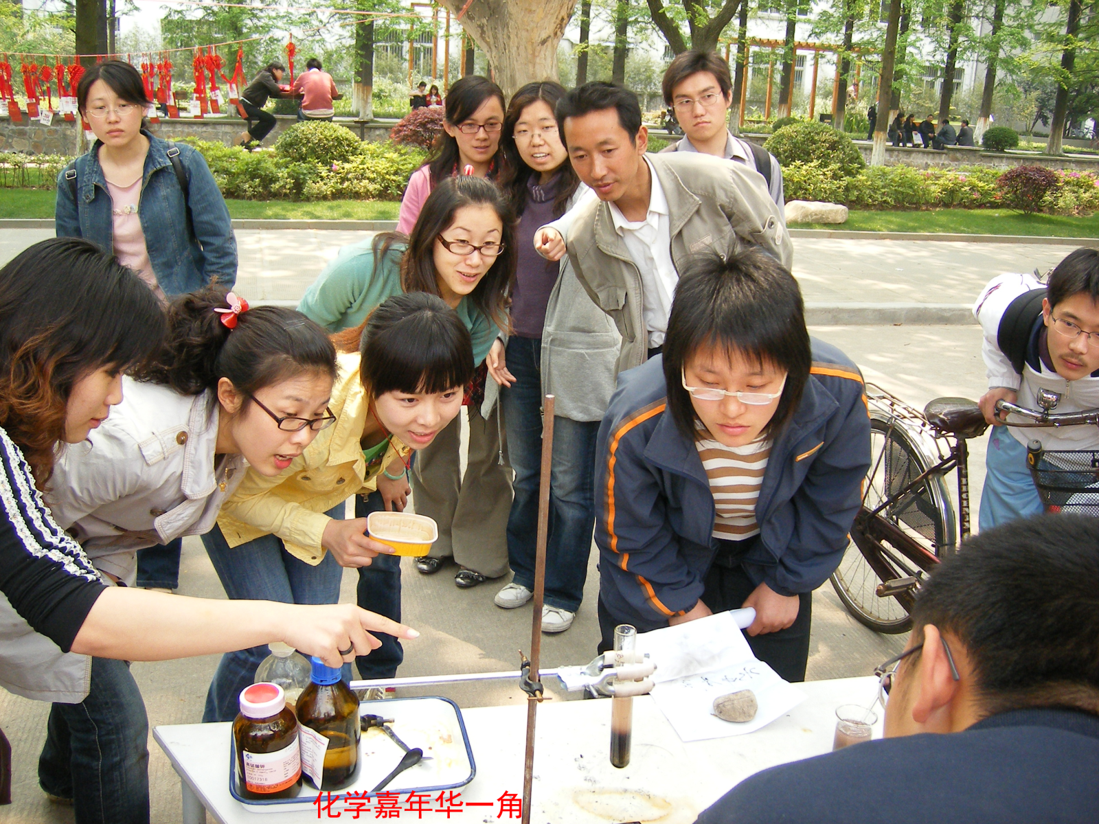 化学嘉年华已经是该系的传统项目了,这个项目集化学实验室开放、化学嘉年华游园会、系列讲座、系文化展示、联合知识竞赛、趣味体育等多项内容于一体,近年来又与毕业晚会相结合,面向全校开放,影响越来越大。“‘嘭——’瓷制的蒸发皿裂成两半,是什么有如此大的杀伤力?你能想到过氧化钠和蔗糖吗?在化学系同学的帮助下,一位其他专业同学小心翼翼地将过氧化钠和蔗糖搅拌混匀,水流一接触到混合溶液,就立刻燃起了火苗,随即炸裂了蒸发皿。‘真是太奇妙了,太神奇了!’观看的同学直呼过瘾,迫不及待地尝试起来。”这是嘉年华上发生的一幕,相似的节目还有火山喷发、香水配置、喷雾作画、晴雨花、热冰、荧光剂等化学趣味实验。