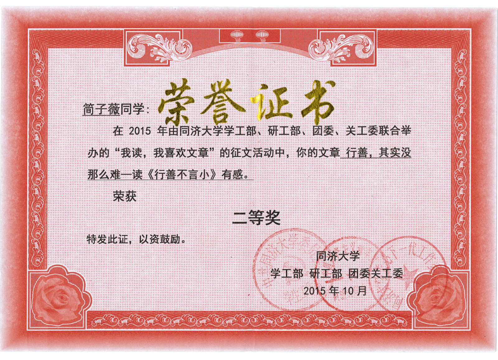 获奖征文链接1:行善,其实没那么难 ——读《行善不言小》有感(化学系 简子薇)