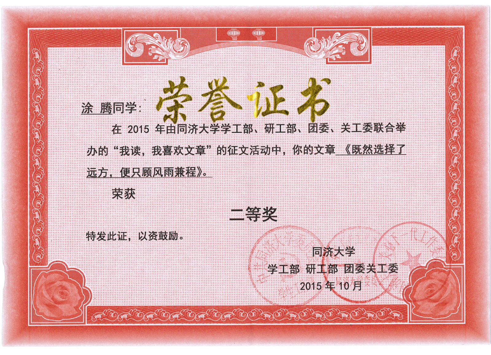 “我读,我喜欢文章”网上阅读活动读后感征文比赛于今年上半年由学校学生工作部、研究生工作部、校团委和关心下一代工作委员会共同举办,旨在促进关工委网站与读者交流互动,落实网站为青年和学生健康成长服务、做青年知心朋友的宗旨,特面向校内青年和学生,征集针对本关工委网站发表文章的读后感、评论、随笔或杂谈。