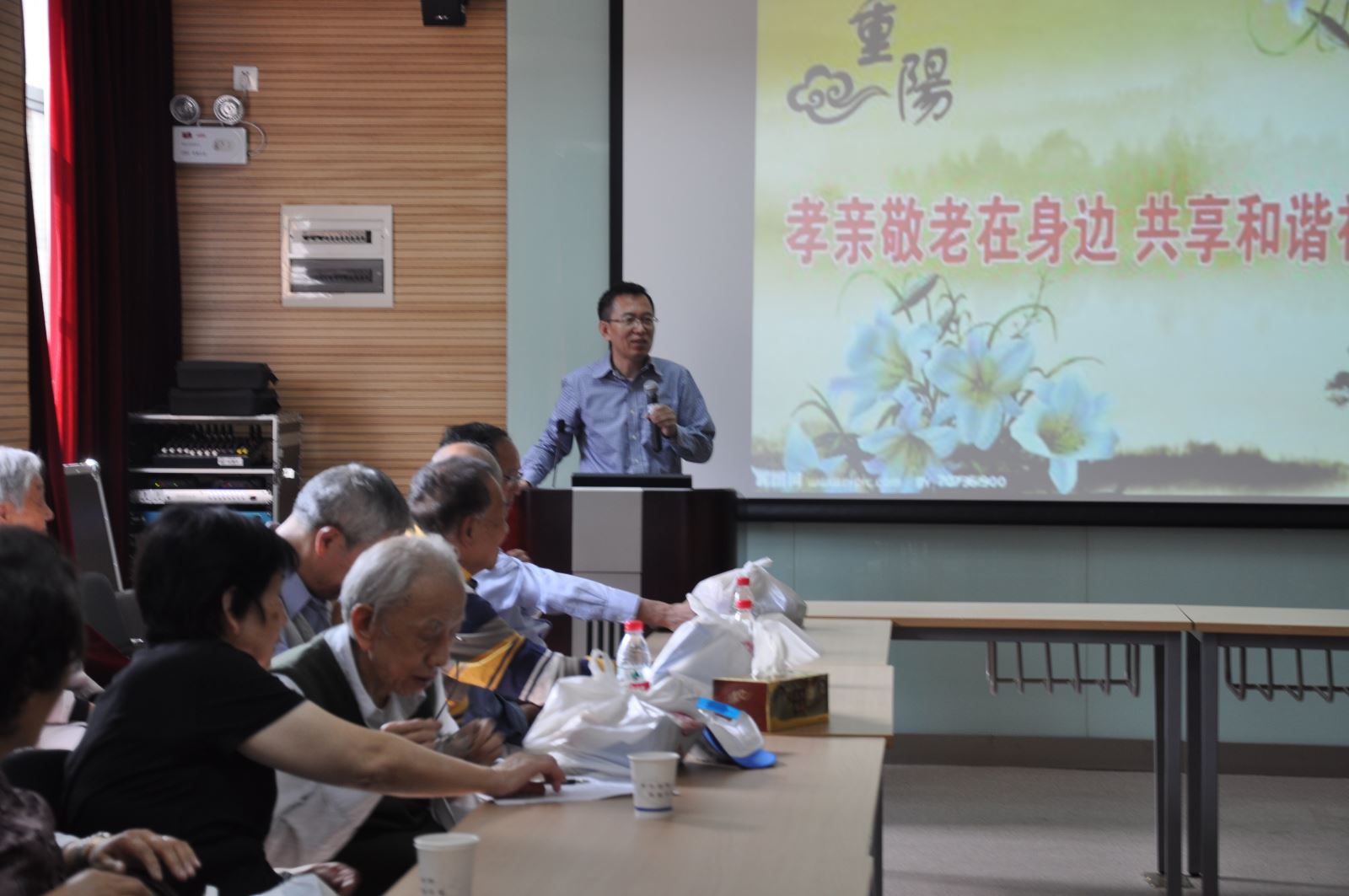 2015年10月23日上午,近四十位曾经在化学系工作,为化学系的发展做出贡献的离退休老教师应邀“回娘家”,参加一年一度的重阳节活动。活动在化学馆120室举行,系党委书记王国强主持活动时代表全系师生向老教师们表示热烈的欢迎并致以节日的问候,感谢老教师们为化学系的发展作出的卓越贡献,祝愿他们身体健康、家庭幸福,安度晚年。系主任王雪峰介绍了化学系近一年来的发展情况并结合“十三五”规划的制定工作对化学系的未来发展进行了展望。
