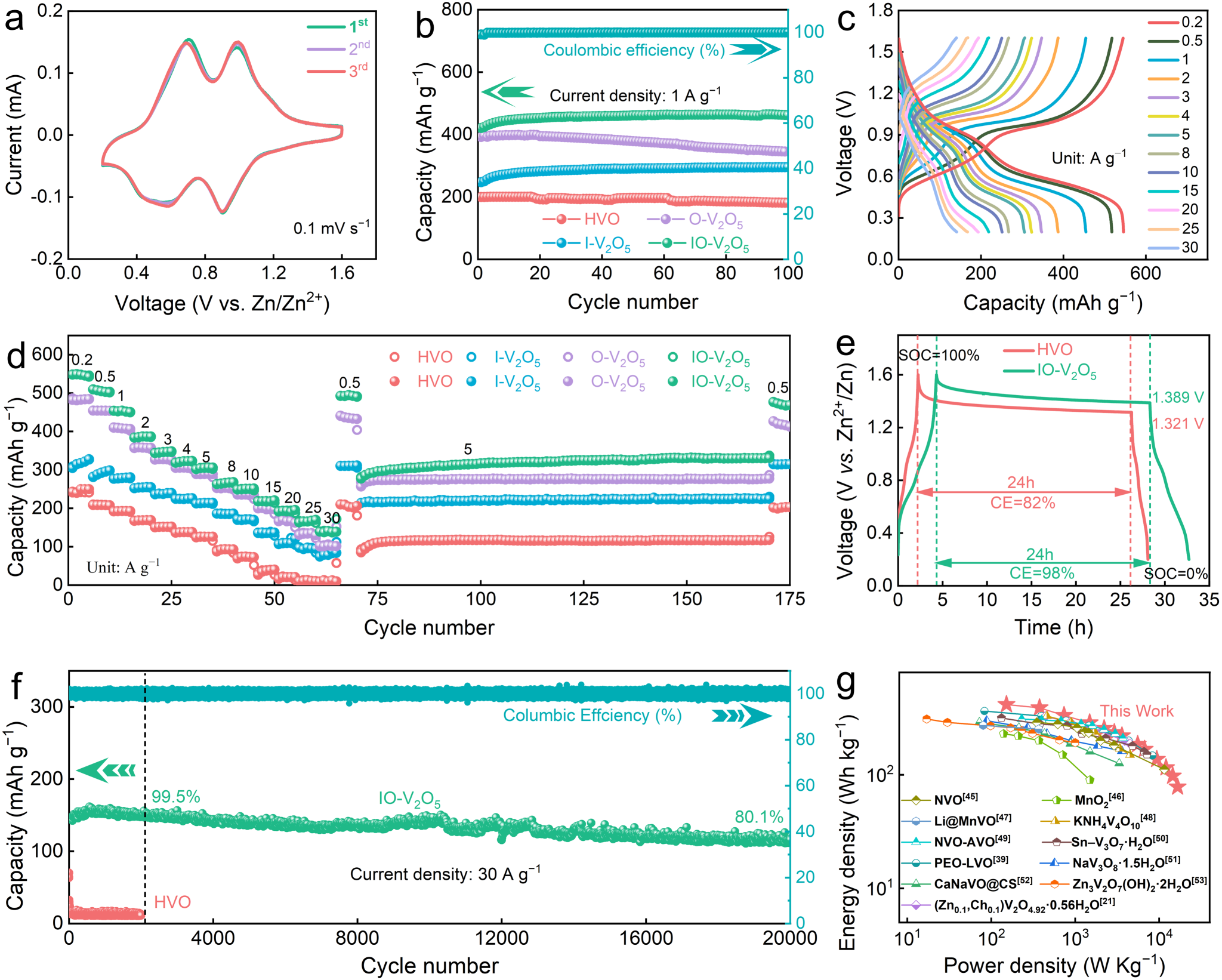 电化学研究表明,Zn||IO-V2O5电池表现出高比容量(549.5 mAh g−1@0.2 A g−1)、长循环寿命(20,000次循环后容量保持率为80.1%)和优异的能量密度(416.3 Wh kg−1)。