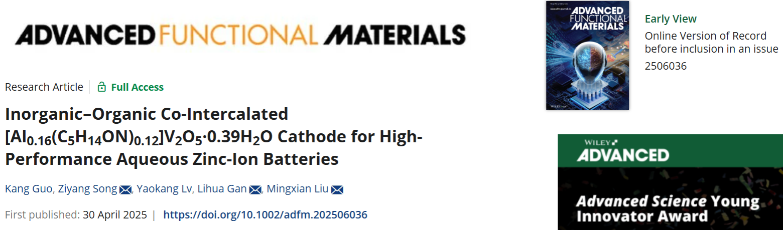 我院刘明贤教授、甘礼华教授团队长期致力于高效储能材料研究并应用于新能源电池开发,课题组近期设计了无机(Al3+)-有机(甜菜碱)共插层的V2O5正极材料[Al0.16(C5H14ON)0.12]V2O5·0.39H2O(IO-V2O5),其中Al3+和甜菜碱创建了快速Zn2+传输通道,甜菜碱中季铵基团与V2O5晶格氧结合稳定了层状结构,羧酸基团削弱了Zn2+/V−O相互作用,显著提高了Zn2+的扩散动力学(10−8~10−7 cm2 s−1)和存储稳定性(20,000次循环后容量保持率为80.1%)。相关成果以“Inorganic-Organic Co-intercalated [Al0.16(C5H14ON)0.12]V2O5·0.39H2O Cathode for High-Performance Aqueous Zinc-Ion Batteries”为题在线发表于国际化学/材料领域著名期刊《先进功能材料》(Advanced Functional Materials)。