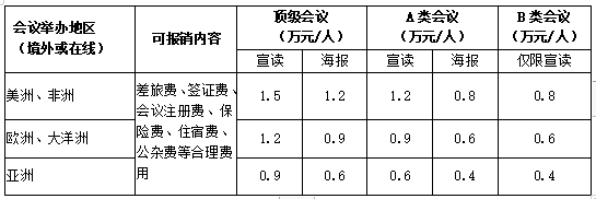 5、本基金2023年度主要用于资助学生赴境外参加列入《永利集团各院系(学科)研究生重要国际学术会议目录》(2021年10月修订版)中国际学术会议所产生的会议注册费用,申请人须本人赴境外在该会议上进行口头报告或海报,并提供含有会议主办方出具的口头报告录用证明及本人进行口头报告的参会高清照片等辅助证明材料。同一个会议被列入多个学科目录中,则按本学科专业规定的标准执行。如申请的会议属于跨学科,可参照其他相关学科的国际会议进行资助,均须经学院会议基金专家组评议后确定。资助标准如下