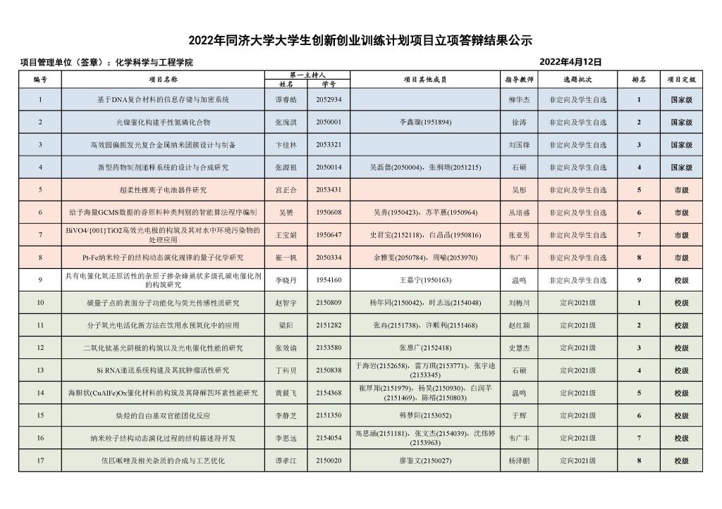 2022年大学生创新创业训练计划项目立项答辩日前在线上完成。答辩分成“面向2021级定向项目”和“非定向及学生自选项目”两组进行,参加立项申请答辩的17个项目均准予立项,并根据学校分配的各级别项目名额对项目进行了定级,现将结果公示如下。如对结果有异议,请联系刘老师,liuyf@tongji.edu.cn。公示期:2022年4月9日 - 4月15日。