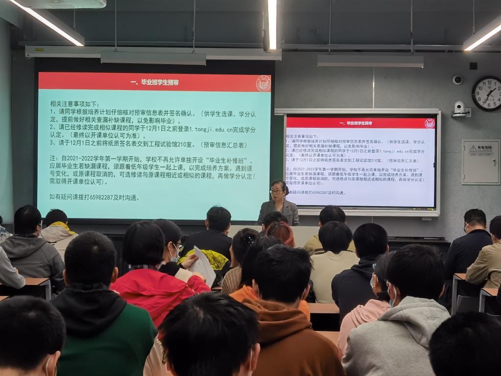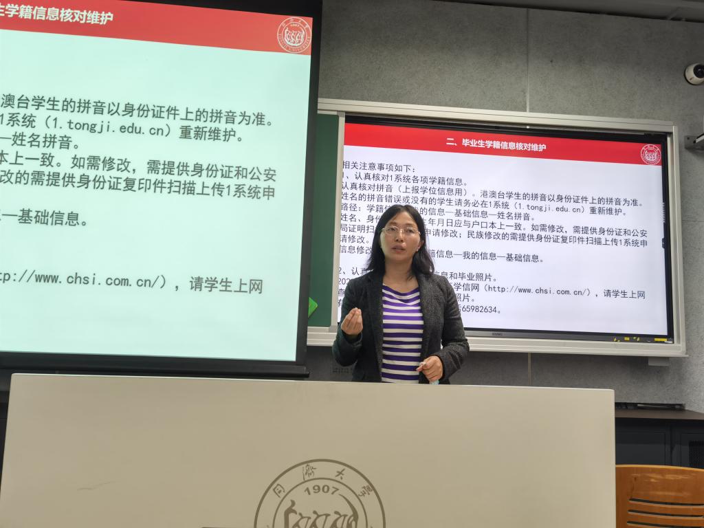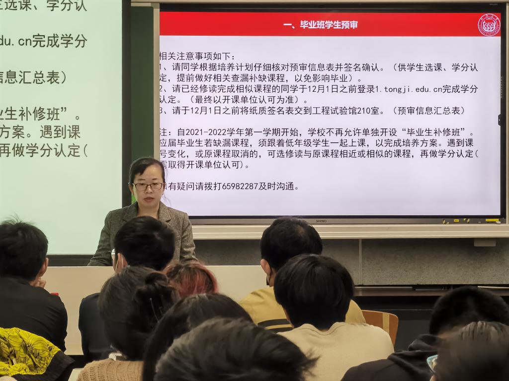 首先,学院副院长刘梅川向同学们介绍有关毕业的两项工作。一、毕业班学生预审,根据培养计划仔细核对预审信息表,并完成各类课程认定;二、毕业生学籍信息核对维护,核对1系统各项学籍信息、核对学信网学籍信息和毕业照片。她提醒同学们相关工作非常重要,关系到同学们毕业事宜,请同学们务必重视,有困难、有问题随时联系相关负责老师。