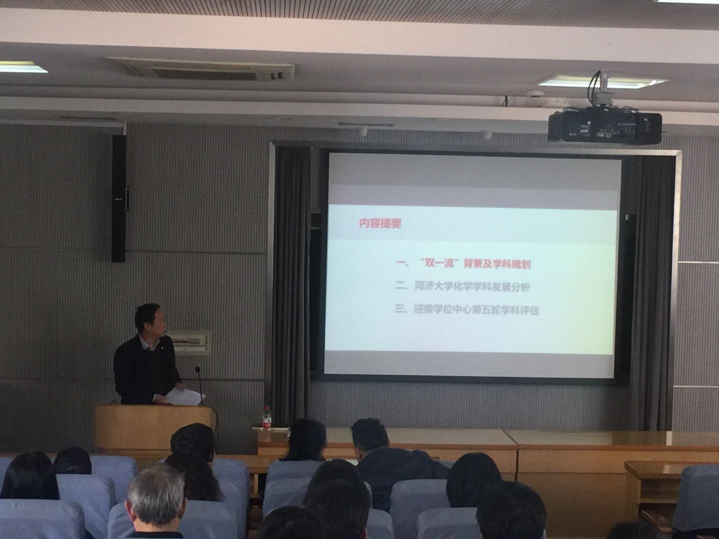 蔡三发首先从国家一流大学与一流学科建设方案与总体规划、国务院学位委员会关于学位授权工作有关要求、国家加强基础研究战略、学校第十一次党代会拟定的学科建设与发展规划情况等背景介绍入手,指出国家对于基础研究的重视以及学校提出“厚重理科融合推动”思路对于化学学科发展的重要性,重点介绍了学校学科建设与发展规划中与学院发展相关的有关内容。蔡三发接着从同济化学、化工学科在ESI、QS、软科等国内外知名排行榜上的表现情况,化学学科在第三、第四轮学科评估的表现对比情况分析和第四轮学科评估中同济化学学科在各指标上的表现情况等方面分析了化学学科的现状、优势和劣势,着重结合发展规划部高等研究所对化学学科发展所做的分析报告对化学学科今后需要加强的方面与在座教职工进行了交流。最后,蔡三发结合最近国际国内相关发展情况,分析了学科水平评估的走向,对即将启动的第五轮学科评估需要重视的几个关键点进行了分享,希望化学学科做好相关工作,争取在第五轮学科评估中取得更好成绩。