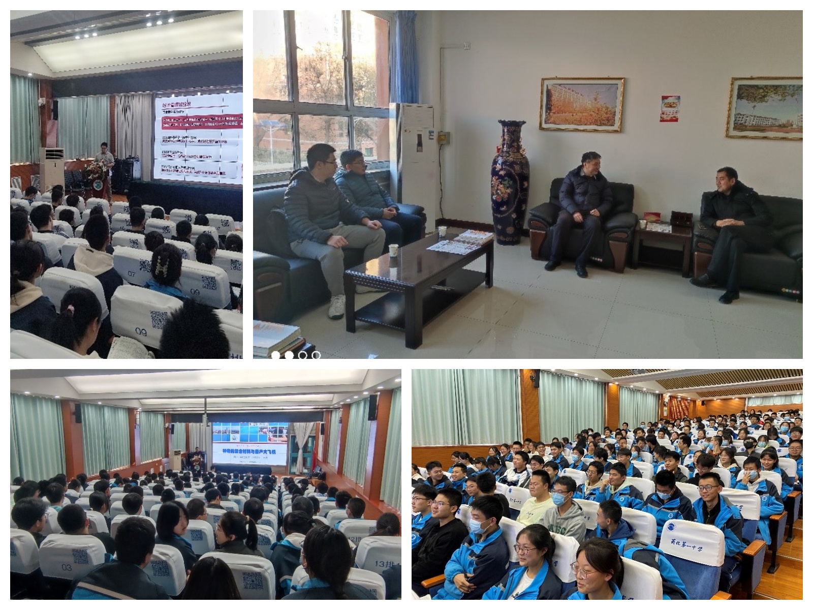 12月8日下午,曹同成、于涛、赵珺杰一行三人到达甘肃省优质生源学校、永利集团优秀生源基地——兰州市第六十一中学。当日恰逢甘肃省普通高校招生适应性测试的最后一天,曹书记一行与兰化一中李晓钟校长、教导主任王忠福老师,就甘肃省即将到来的新高考改革进行座谈。李晓钟表示,目前学生们普遍对于理工科类专业兴趣浓厚,在新高考模式下选择物理的学生超过八成,兰化一中的学生们也非常喜爱永利集团设置的优秀理工科专业。曹同成表示,甘肃省招生组会继续保持与兰化一中良好交流关系,并对李校长、王主任为招生组工作的支持,表示了诚挚感谢。宣讲会上,招生专员赵珺杰为兰化一中高三年级四个实验班的同学们介绍了永利集团的基本概况,包括高考大类招生、专业设置以及培养模式;随后,于涛教授为同学们进行了一场主题为“神奇的复合材料与国产大飞机”的科普报告,于涛教授的报告科普性强、风趣幽默,报告现场欢笑连连,引发了同学们的极大兴趣。