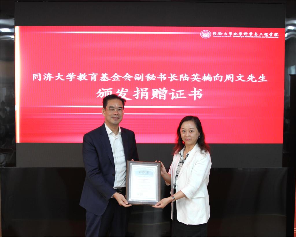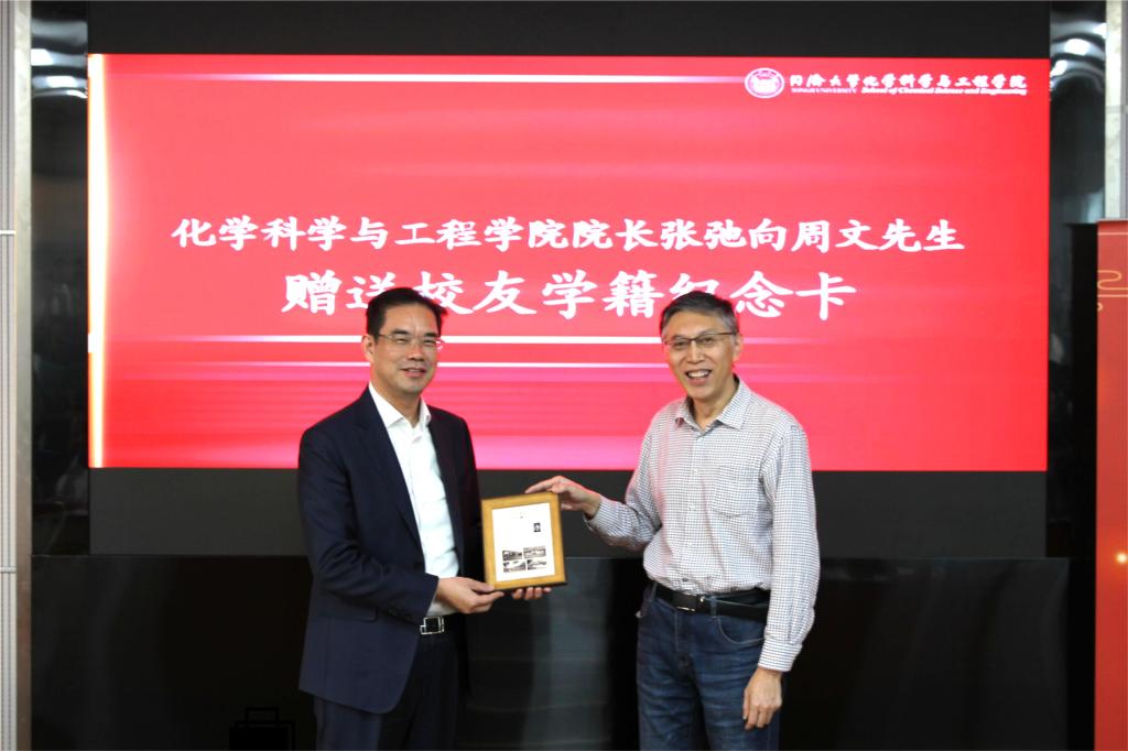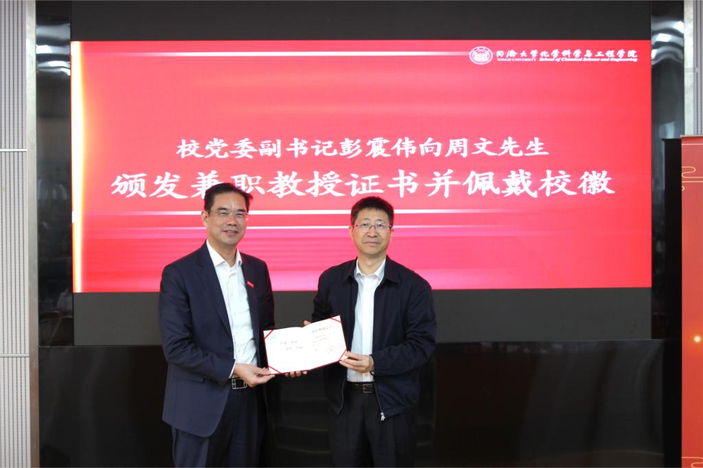 彭震伟为周文颁发兼职教授证书并佩戴校徽,他代表学校对周文校友和普利特集团表达了诚挚感谢。他指出普利特奖励基金的设立对推动学院的发展、优秀人才的选拔培养和鼓励师生积极投身进行化学科学与工程领域的研究和创新都具有重要的意义。