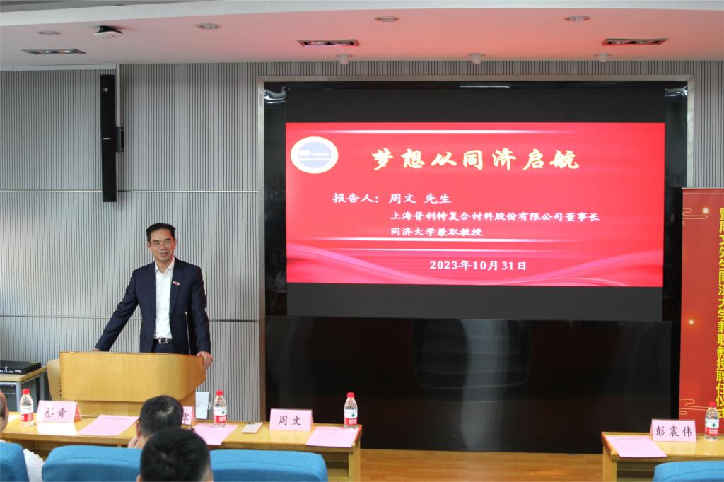 仪式结束后,周文应邀做客同济化学高等讲堂,以“梦想从同济启航”为题发表了主题演讲。他深情回顾了自己在同济的求学和个人成长经历,分享了创业的心路历程和体会。周文鼓励在场的师生们勇敢追求梦想,不断努力,为社会的进步和发展做出贡献。周文强调,普利特一直致力于推动产学研合作,以科技创新驱动经济发展,这与永利集团发展理念高度契合。现场师生与周文积极互动交流。曹同成为周文颁发了高等讲堂纪念证书。