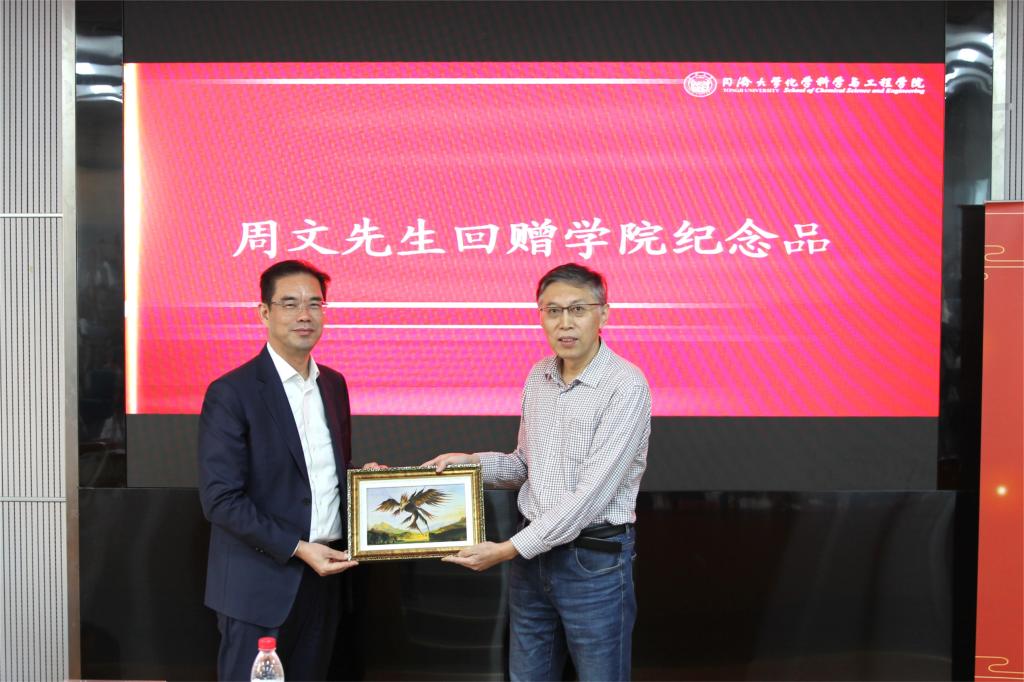 陆英楠向周文颁发捐赠证书,张弛向周文赠送了校友学籍纪念卡,周文回赠学院“鲲鹏展翅”纪念铭牌。