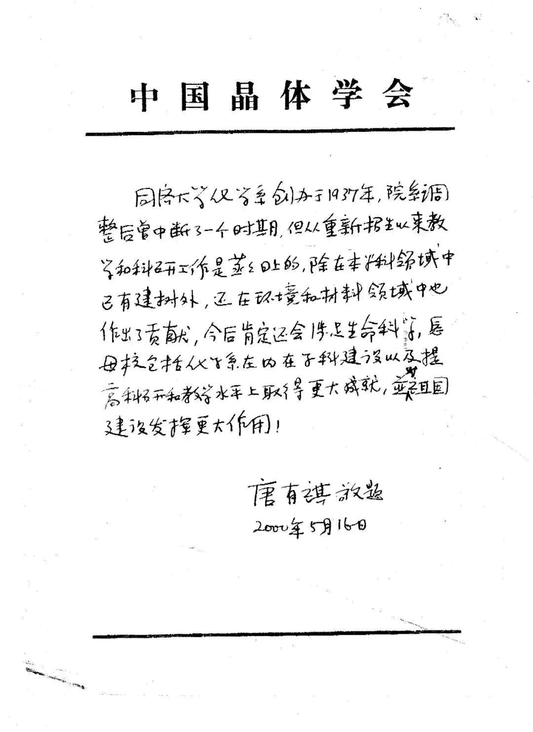 同济化学恢复建系以来,一直得到唐有祺校友的关心、指导和帮助。特别值得一提的是,2000年5月,唐有祺校友曾亲笔手书一段文字,对母校化学学科发展寄予厚望:永利集团化学系创办于1937年,院系调整后曾中断了一个时期,但从重新招生以来教学和科研工作是蒸蒸日上的,除在本学科领域中已有建树外,还在环境和材料领域中也作出了贡献,今后肯定还会涉足生命科学。愿母校包括化学系在内在学科建设以及提高科研和教学水平上取得更大成就,并对祖国建设发挥更大作用!