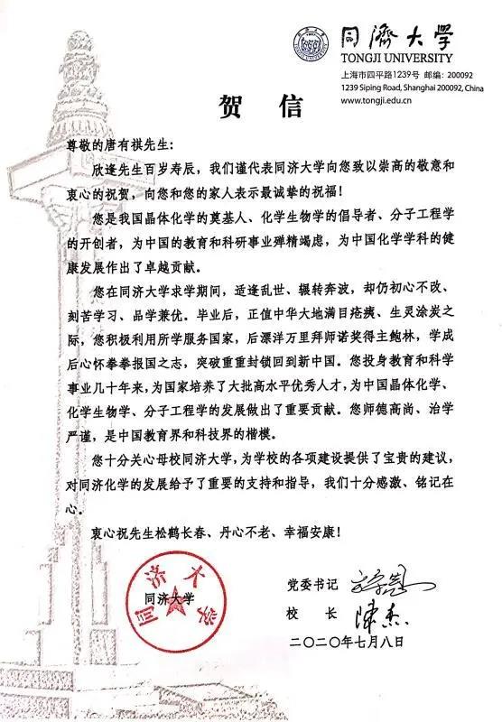 值此先生百岁华诞之际,同济后辈对唐先生的关心和支持铭记在心,永怀感激,衷心祝愿先生松鹤长春、丹心不老、幸福安康!