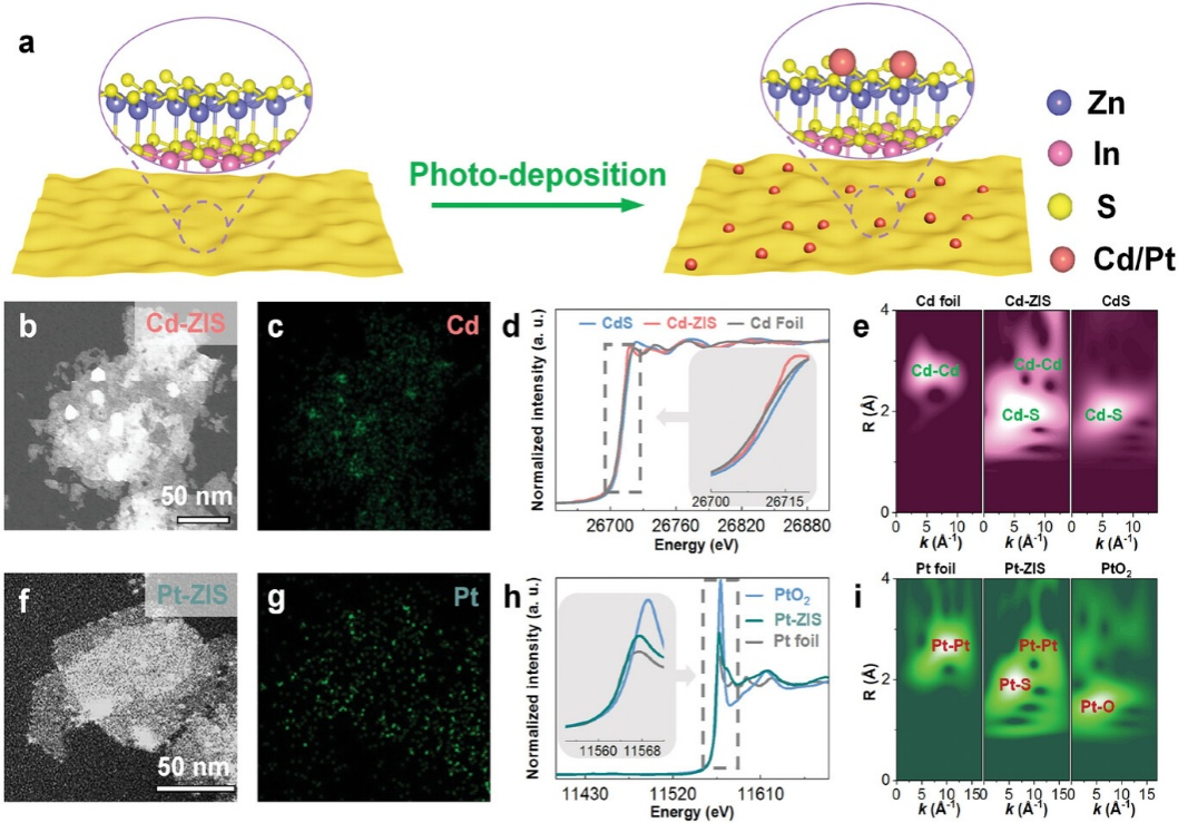 研究团队通过原位锚定两种助催化剂Cd和Pt在Zn2In2S5纳米片表面,实现苯甲醇高选择性转化为特定产物。TEM及 X 射线吸收光谱证明这些助催化剂为金属纳米颗粒,Pt-S/Cd-S键的存在表明Cd/Pt和 Zn2In2S5之间存在很强的金属-基底相互作用。