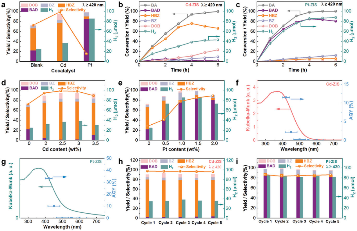 光催化苯甲醇转化实验结果表明,Pt助催化剂的转化产物为苯甲醛, 其420 ± 20 nm 处的表观量子产率(AQY)可达33.2%;而Cd助催化剂的转化产物为C-C偶联产物,420 ± 20 nm 处的AQY可达11.5%。两种助催化剂均表现出优异的转化稳定性。