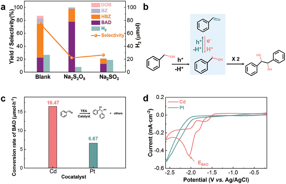 进一步研究表明,相较于Pt助催化剂,Cd助催化剂具有优异的苯甲醛还原能力,是导致苯甲醇高选择性转化为C-C偶联产物的主要原因。