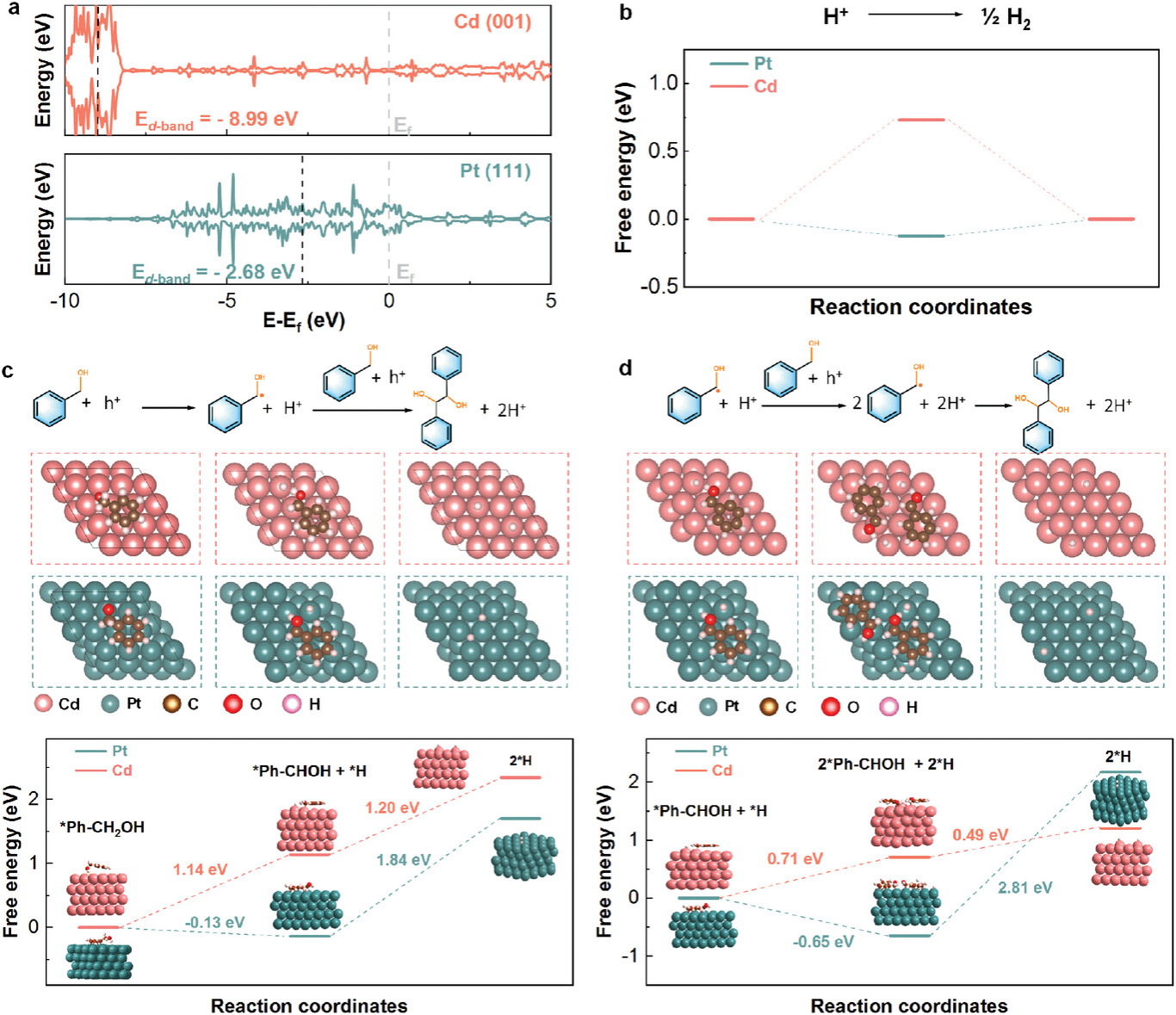 DFT理论研究表明,Pt (111) 表面对反应中间体的吸附能力强于Cd (001) 表面,是导致反应中间体进一步氧化生成苯甲醛的重要原因。从C-C偶联反应的自由能变化角度来看,Cd (001) 表面相较于Pt (111) 表面具有明显更低的反应自由能改变,从而解释了Cd助催化剂有利于C-C偶联产物生成的原因。这一研究工作为操控光催化有机物转化的选择性提供了新思路。