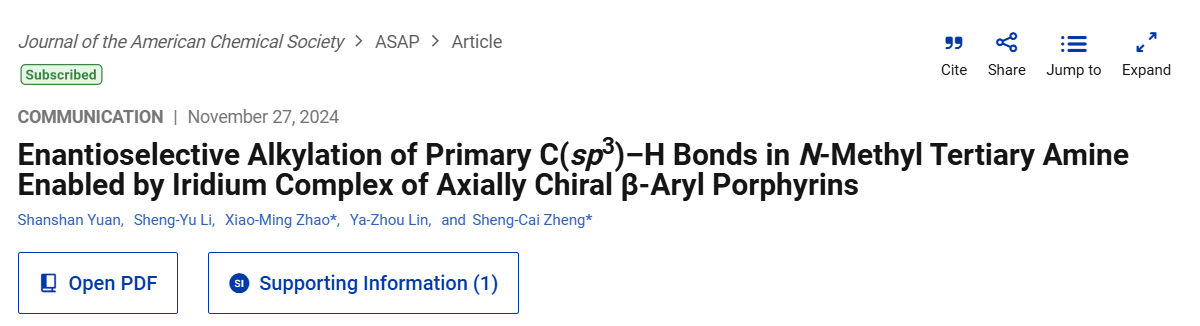 三级胺在医药及催化领域有着广泛应用。众多阿片类镇静剂药物的都含三级胺的主体结构,如芬太尼、吗啡与尼古丁等药物。对该类药物的N-甲基位直接修饰获着更具活性及抗耐药性的单一手性构型新药,有着更强的目标性及经济性,是科学家一直以来的追求目标。在近日,郑生财研究员与赵晓明教授研究团队利用其团队开发出的原创轴手性卟啉(Angew. Chem. Int. Ed. 2024, 63, e202404329)作为配体,辅助金属铱催化剂对含甲基三级胺类化合物实现了特异性的选择不对称催化。构建出众多含β-手性的三级胺。相关研究成果“Enantioselective Alkylation of Primary C(sp3)–H Bonds in N-Methyl Tertiary Amine Enabled by Iridium Complex of Axially Chiral β-Aryl Porphyrins”在线发表于国际知名期刊《美国化学会志》(Journal of the American Chemical Society)。