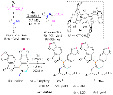 该策略解决了一个长期困扰卡宾直接修饰三级胺邻位C-H键的难题,摆脱了烷基胺类化合物需先钝化保护、脱保护再衍生成三级胺的多步合成策略,一步实现直接实现三级胺邻位C-H键不对称烷基化。将该方法用于天然产物比扣扣灵的后修饰,可以得到单一手性构型的天然产物衍生物。为带N-Me基团的手性天然生物碱的发散性衍生打通了一条捷径。