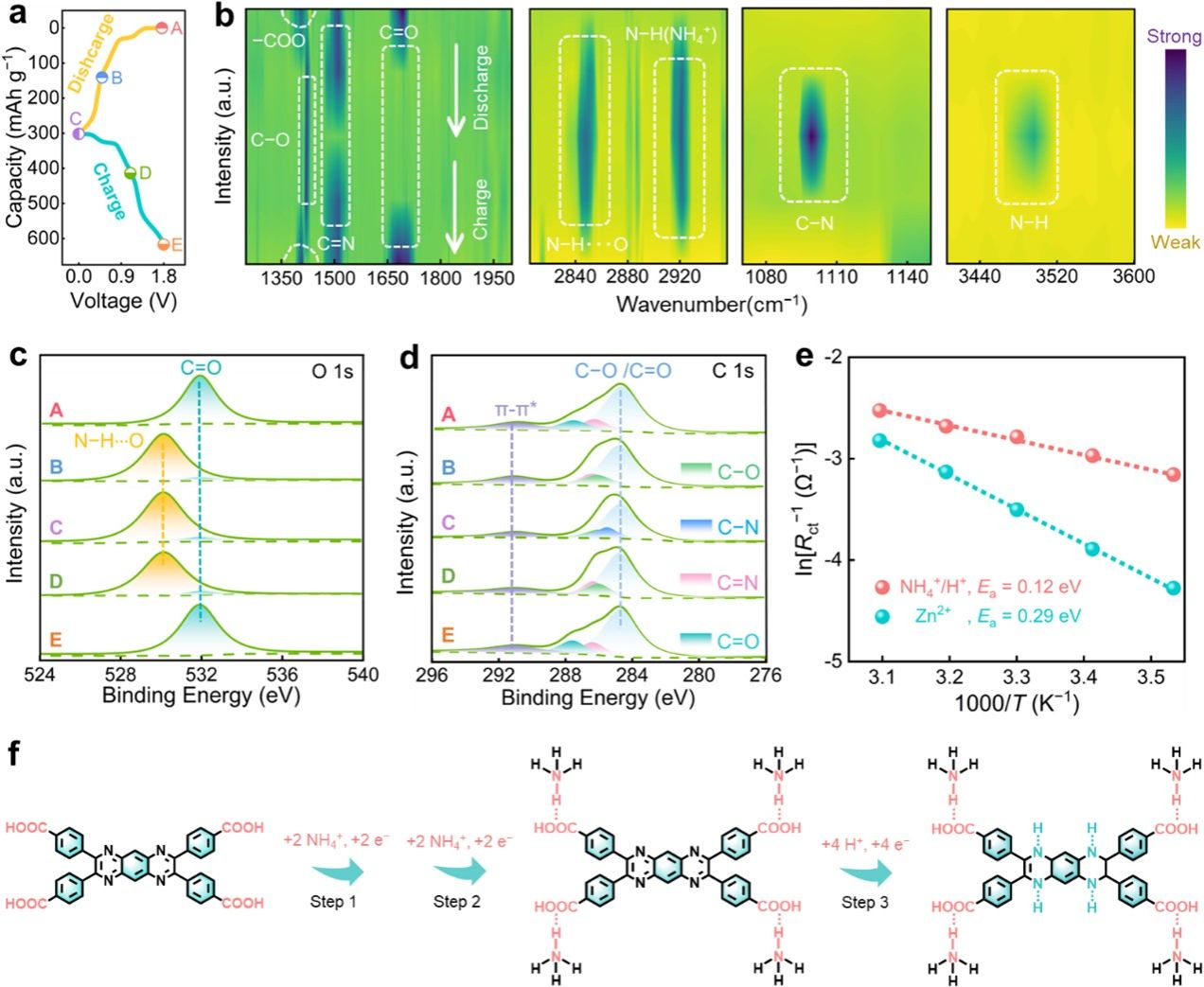 异位光谱和分子动力学模拟研究表明:得益于较低的活化能(0.12 vs. 0.29 eV),羧基/亚胺活性基团能够与高动力学的NH4+/H+电荷载体优先配位,克服了Zn2+因高去溶剂化能垒而导致的缓慢界面电荷转移,有效降低了电荷传输能垒,实现了稳定快速的三步八电子氧化还原反应。