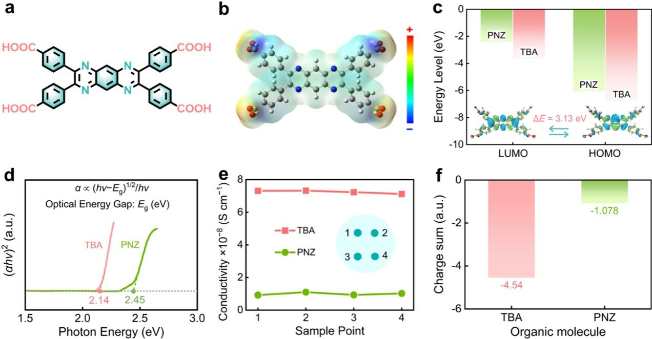 实验表征和理论计算表明:得益于羧基调控的扩展π-共轭氮杂环芳香结构,TBA具有低能带间隙、高电子导电性和低活性位点电荷总和,有助于提高电子转移效率和电极氧化还原速率,赋予TBA快速氧化还原动力学。