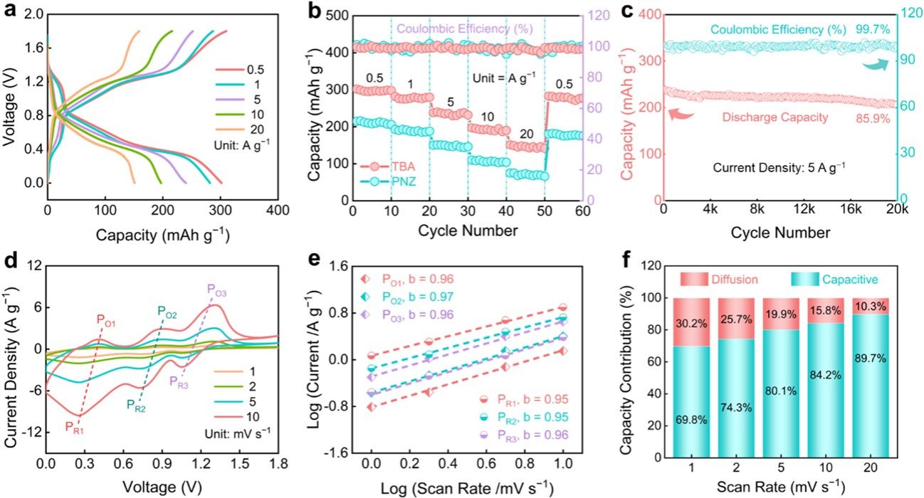 电化学研究表明:TBA用于水系锌-有机电池正极材料时,表现出高比容量(302 mAh g−1@0.5 A g−1)、高倍率性能(151 mAh g−1@20 A g−1)和长循环寿命(20,000次充放电后容量保持率为85.9%)。