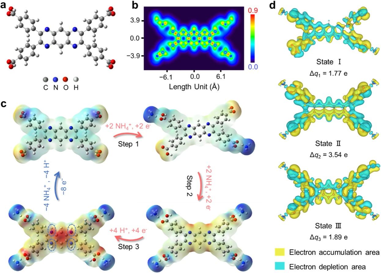 得益于氮原子上孤对电子,含C=N基团的亚胺小分子通常具有高氧化还原活性、优异电化学可逆性以及快速反应动力学。然而,亚胺小分子活性位点不足和分子轨道能间隙较大,限制了正极容量和电子传输动力学,且亚胺小分子在水系电解液中较高的溶解度往往会引发电池循环过程中不可逆的容量损失。将吸电子基团(如−COOH)引入到亚胺小分子结构中,对其电子结构和电化学活性进行调控,有望促进其电子离域和氧化还原动力学,进一步提升电池性能。