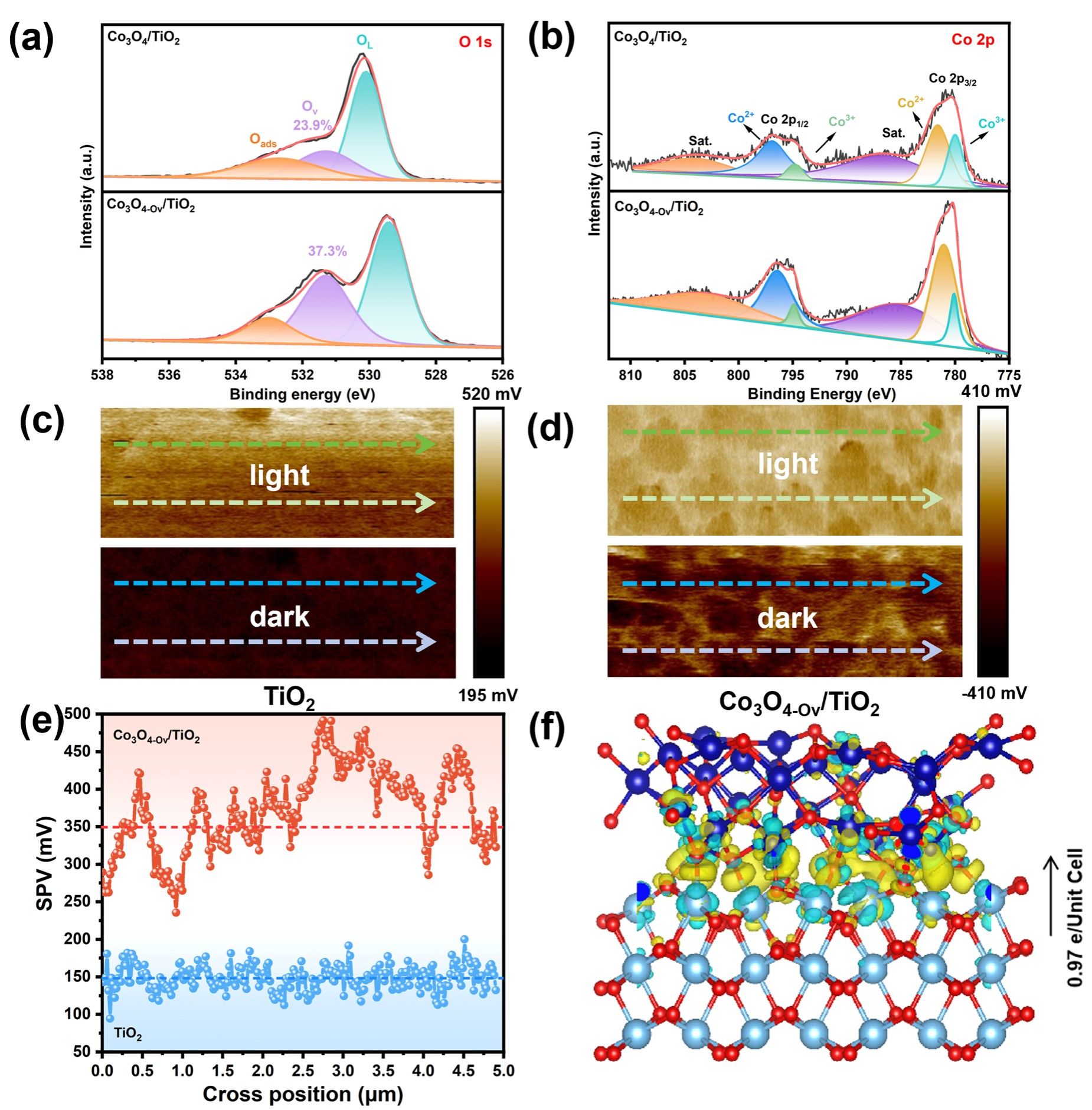 XPS 结果进一步表明了 Co3O4 中富含氧空位,作为电子供体掺杂剂可以促进载流子的转移和分离。差分电荷密度计算和开尔文探针力显微镜(KPFM)技术清晰地阐明了Co3O4和TiO2之间的电荷转移机制。当 p型半导体Co3O4和n型半导体TiO2 在黑暗中接触时,由于TiO2 较低的费米能级和功函数,电子(e-)会从 TiO2 转移到 Co3O4,直至两者的费米能级达到平衡。这一过程中,界面处的电荷重新分布,在TiO2 和Co3O4 之间形成内建电场,阻止了 TiO2 中e-的持续转移。同时,TiO2 的能带边缘向上弯曲,而Co3O4的能带边缘则向下弯曲。在光照条件下,光生电子通过 p-n 异质结转移到 TiO2,而空穴(h+)则转移到Co3O4,从而实现了高效的电荷分离。此外,TiO2中的电子会通过({111}/{101} /{110})晶面异质结进一步转移至基底,并迅速到达阴极。综上所述,Co3O4-Ov/TiO2材料表现出优异的光电化学性能,归因于氧空位和双异质结(“p-n结/晶面结”)的协同作用。