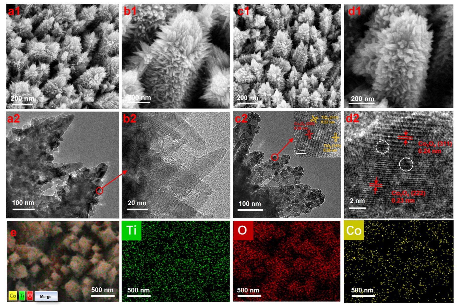 SEM和TEM表征结果显示:Co3O4-Ov/TiO2光电极材料的基底结构是由Ti网上原位生长的一维有序TiO2纳米棒和二维纳米锥构成。同时,零维的Co3O4纳米颗粒均匀分布在3D TiO2结构上,其无序的晶格和模糊的边界均表明存在氧空位。