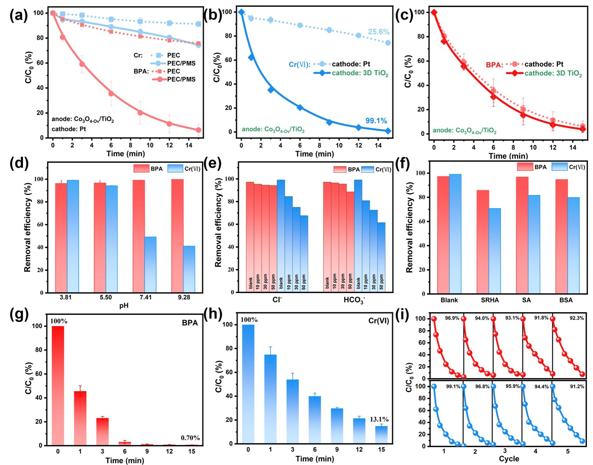 将Co3O4-Ov/TiO₂-PEC/PMS系统应用于模拟废水中BPA和Cr(VI)的同步去除,仅在15 min内对BPA和Cr(VI)的去除率分别达到96.2%和 99.1%,进一步在实际废水体系中同样表现出优异的去除效果,证实具有良好的实际应用前景。这项工作为水环境中复合污染物的高效同步去除提供了重要的思路。