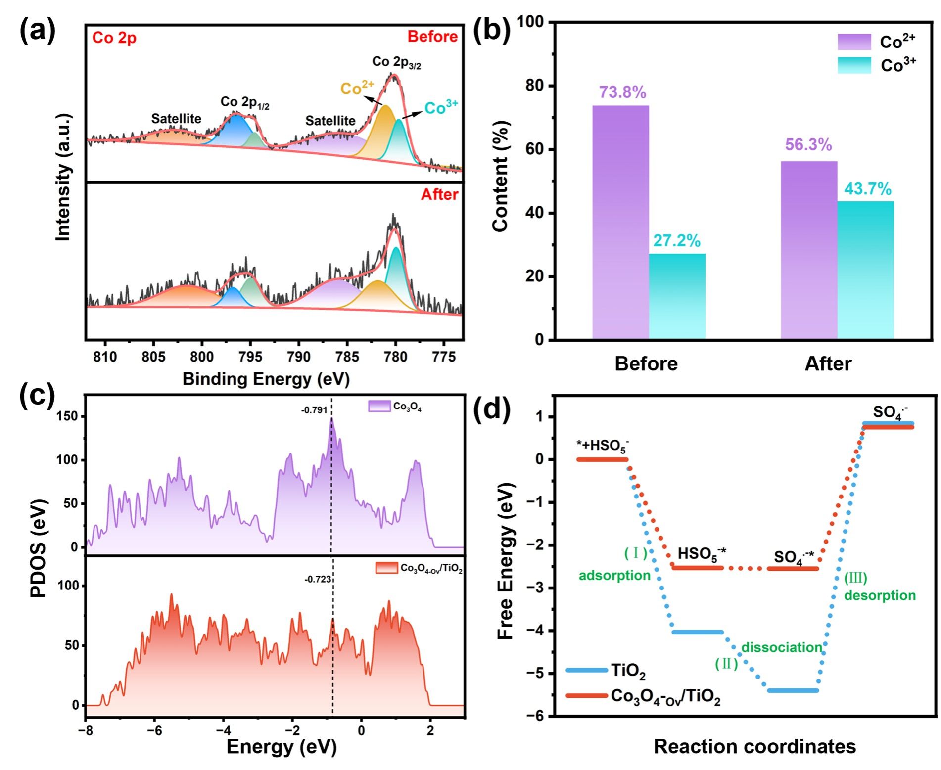 XPS表征表明Co3O4-Ov/TiO2中Co3+/Co2+氧化还原循环能够加速PMS的活化。DFT计算进一步详细揭示了光电极与PMS分子之间的相互作用机制。偏态密度(PDOS)分析表明,PMS与Co3O4-Ov/TiO2之间的键合更为稳定,这意味着Co3O4-Ov/TiO2对PMS具有更强的化学吸附能力。此外,通过计算吉布斯自由能(ΔG),对PMS的整体活化过程进行了热力学分析,结果表明引入Co3O4显著提升了PMS的活化效率。