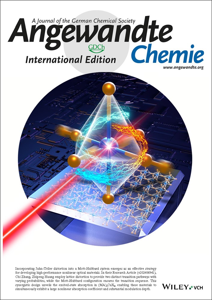 欧洲科学院院士、德国国家工程院院士、yl9193永利集团张弛教授和黄智鹏教授研究团队提出引入晶格畸变提高Mott-Hubbard体系材料非线性光学吸收性能的策略,使(MA)2CuX4 (MA = methylammonium, X = Cl, Br)体现出优异的非线性光学吸收系数和大的调制深度。相关成果“Unlocking Giant Third-Order Optical Nonlinearity in (MA)2CuX4 through Introducing Jahn-Teller Distortion” (应用Jahn-Teller畸变解锁(MA)2CuX4的巨大三阶非线性光学效应)以研究论文(Research Article)的形式近日正式发表在国际化学领域最重要的学术期刊之一《德国应用化学》(Angew. Chem. Int. Ed. 2024, e202406941)上,被学术同行专家评选为Very Important Paper,并获编辑委员会遴选为期刊主封面文章。