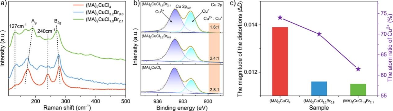 研究团队通过X射线衍射和系列光谱学表征证实(MA)2CuX4内的晶格畸变,且发现随着材料内Cu2+含量增加,晶格畸变程度加剧。