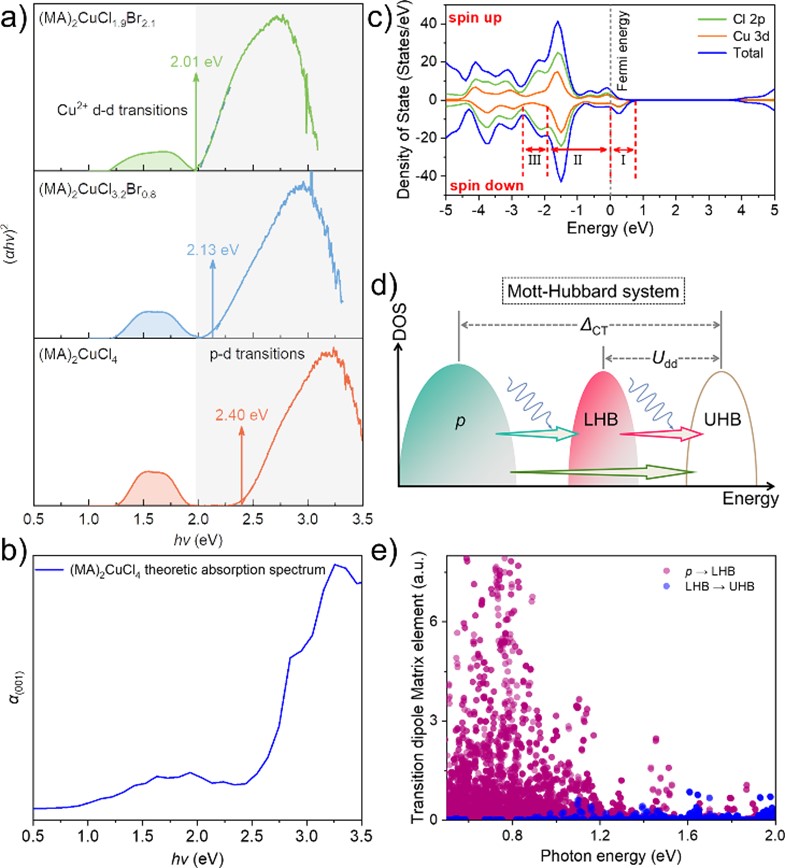 借助紫外可见吸收光谱和第一性原理计算,研究团队发现(MA)2CuX4具有典型的Mott-Hubbard型能级结构,且金属d轨道(LHB)-金属d轨道(UHB)跃迁几率小于配体p轨道-金属d轨道(UHB)跃迁几率。