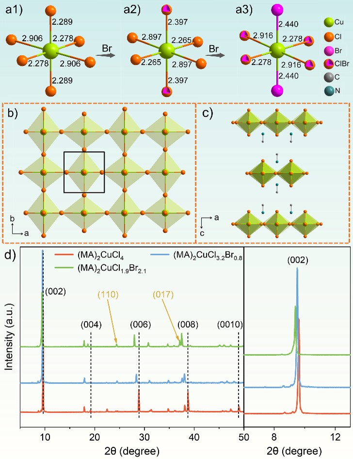 研究团队合成了具有不同卤素比例的二维有机无机杂化钙钛矿(MA)2CuX4 (X=Cl, Br)。在此类结构中,[CuX6]4-八面体因Jahn-Teller效应发生畸变;畸变的八面体通过共用角部的Cl-离子形成二维