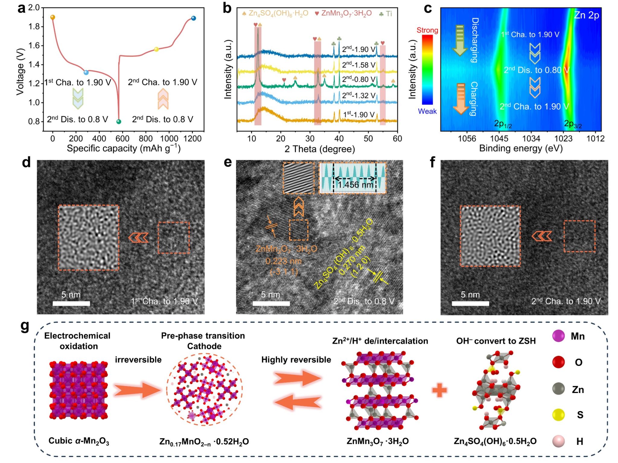 电化学研究表明,α-Mn2O3预相变后的非晶锰基材料具有更高的比容量(558 mAh g−1@100 mA g−1)、倍率性能和循环稳定性(5000次循环后容量保持率为95.85%)。