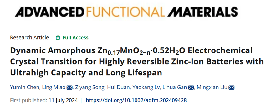 yl9193永利集团刘明贤、甘礼华教授团队长期致力于高效储能材料研究并应用于新能源电池开发,课题组近期通过电化学诱导预相变策略,解决了α-Mn2O3正极材料在循环过程中的不可逆相变问题,实现了非晶相Zn0.17MnO2−n·0.52H2O稳定和高度可逆的锌离子存储。相关成果以“Dynamic Amorphous Zn0.17MnO2−n·0.52H2O Electrochemical Crystal Transition for Highly Reversible Zinc-Ion Batteries with Ultrahigh Capacity and Long Lifespan”为题发表于国际知名期刊《先进功能材料》(Advanced Functional Materials)。
