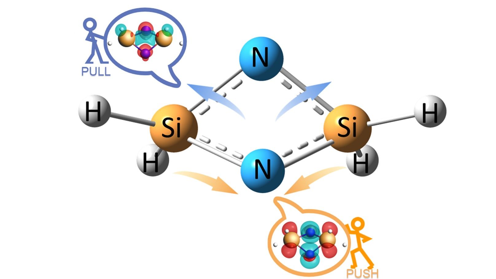 研究人员在4K的低温下,控制基质隔离条件,激光溅射硅原子和H2、D2、 HD、 H2/D2混合气在氮气基质中进行反应,氮气在其中同时作为反应气体和隔离基质。同位素取代实验结合量子化学理论计算确认得到了氮气活化产物H2Si(m-N)2SiH2。经由实验光谱和量子化学理论计算双重确认,由于低温基质隔离环境使得Si---Si距离得以控制,四元环结构H2Si(m-N)2SiH2在两个H2Si:单体的协同作用下实现了N ≡ N三键的裂解。通过EDA-NOCV计算进一步证实了两个H2Si:单体的协同作用,即H2Si:能够同时反馈电子到氮气的p反键轨道(push effect)和减少氮气分子的p成键轨道上的电荷密度(pull effect),从而实现N ≡ N三键的裂解以及生成稳定的芳香性四元环Si2N2。该研究通过双硅烯协同作用,在低温基质隔离条件下实现了对惰性分子氮气的活化,为人工催化活化氮气提供了一种基于硅烯的催化剂设计新思路。