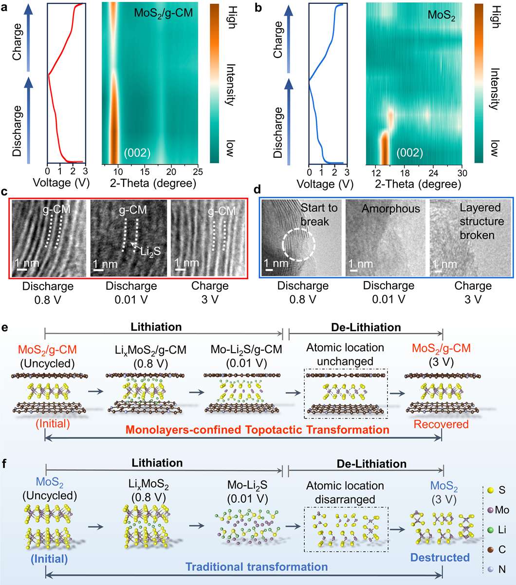 In-situ XRD图谱分析和ex-situ HRTEM分析证明了MoS2/g-CM中的二维结构在充放电循环工程中可以可逆重构且g-CM能稳定存在,并揭示了基于g-CM原子层限域拓扑反应的插层结构的可逆重构特性,及其与电池超快充性能之间的关系。而且,所提出的单层碳插层策略和独特的可重构特性也在二硒化钼(MoSe2/g-CM)体系得到实现,并提升了电池性能,显示了其通用性和应用中的巨大潜力。